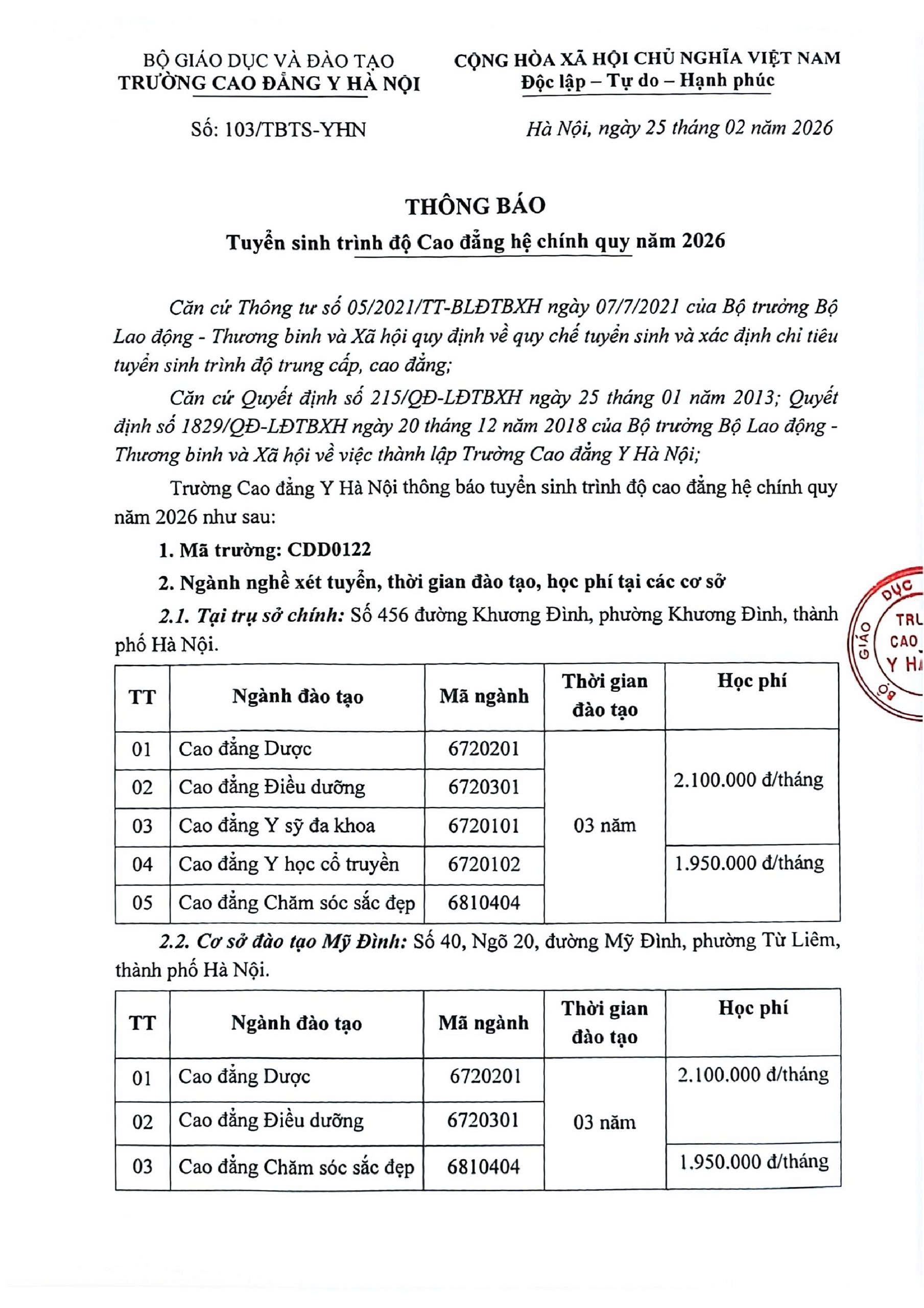 – Website: caodangyhn.edu.vn